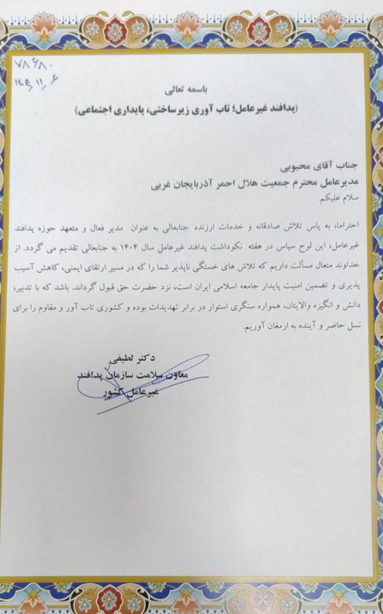 در متن این لوح تقدیر، نقش مؤثر جمعیت هلالاحمر استان آذربایجانغربی در پیشبرد اهداف پدافند غیرعامل، تضمین امنیت پایدار و ایجاد جامعهای تابآور در برابر تهدیدات مورد تأکید قرار گرفته است.